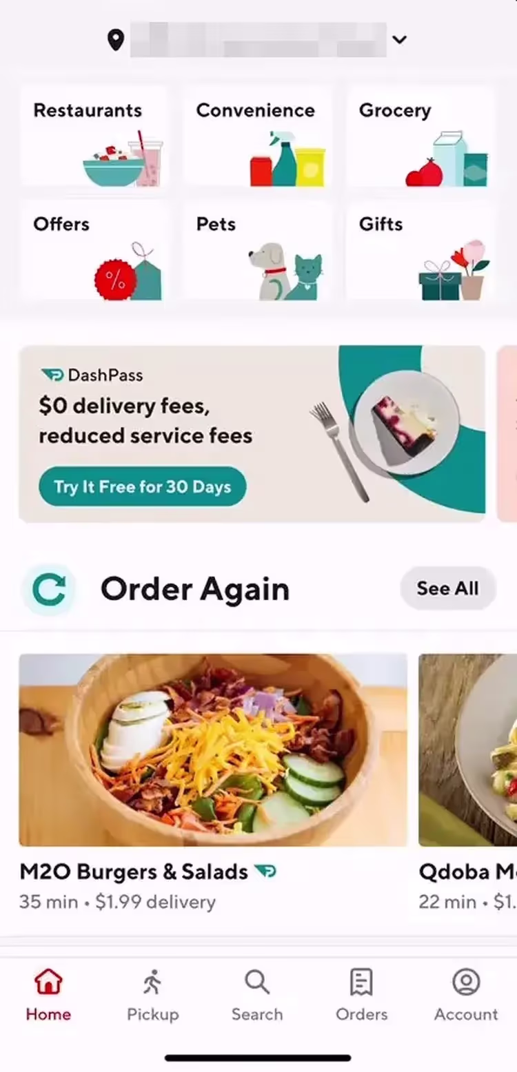 ✅ В Doordash пользователь быстро находил рестораны, в которых он делал заказы ранее. Функция «Заказать снова» (прим. на англ. "Order Again") расположена на главной странице приложения.