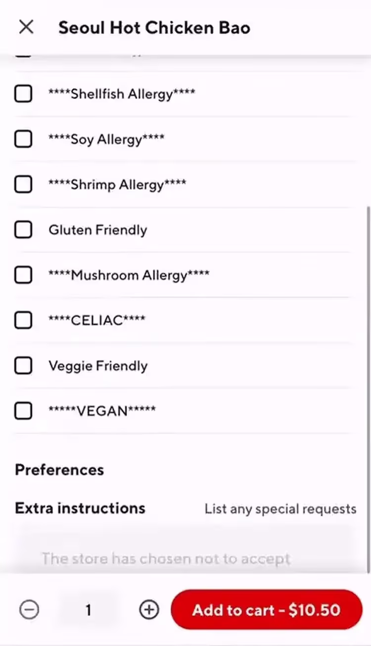 ❌ «Похоже, мне придется удалить все из корзины… Я действительно не вижу другого способа настроить заказ так, как мне нужно, после добавления еды в корзину». В мобильном приложении Doordash предусмотрена возможность добавить или убрать ингредиенты в заказе перед тем, как положить их в корзину (см. первое изображение). Но если пользователь захочет изменить состав ингредиентов после добавления еды в корзину, он не сможет этого сделать (см. второе изображение). Участник тестирования продолжает: «Это же несложно — добавить возможность изменения состава ингредиентов в корзине… на самом деле это раздражает. Например, я хочу добавить не только курицу в одно из блюд с жареным рисом, но и еще пару вещей. И для этого они могли бы предусмотреть еще один дополнительный шаг на этапе, когда еда уже находится в корзине. Отсутствие этой функции бесит». Невозможность легко менять ингредиенты в корзине может способствовать тому, что пользователи просто бросят заказ, если посчитают, что единственная альтернатива — начать все заново.