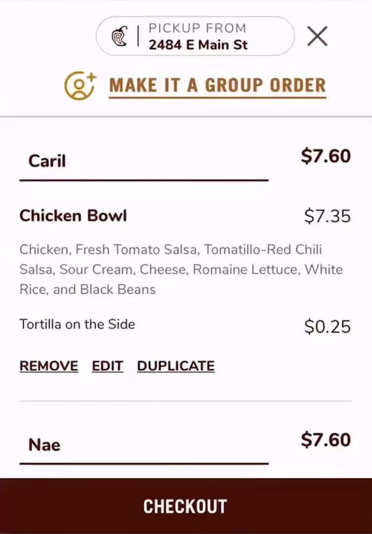 ✅ Chipotle предоставляет четкую ссылку «Редактировать» (прим. англ. "Edit") в корзине для каждого заказанного блюда. Это позволяет пользователям быстро корректировать состав ингредиентов в заказе.