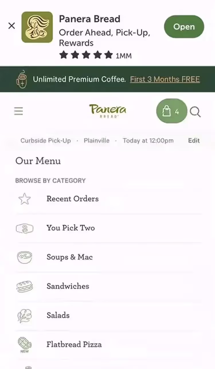 ❌ «Я хочу посмотреть «Меню»… но не могу понять, как это сделать». Пользователь в процессе оформления заказа на вынос на мобильном сайте Panera столкнулся с трудностями при навигации. Это произошло из-за баннера «Установить приложение», который заполнил мобильное окно просмотра, а человек не сразу догадался закрыть рекламу.