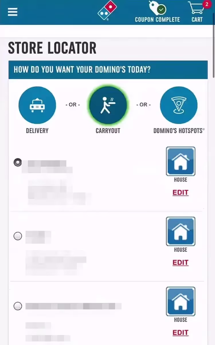 ❌ «Если такое происходит один раз, ок, но если это происходит постоянно, когда я делаю выбор, это раздражает». В Dominos пользователь переключился с «доставки» на опцию «на вынос», но кнопка подтверждения его выбора не появилась (первое изображение). Он покинул страницу, прежде чем понял, что его выбор не сохранился. Затем он попытался еще раз выбрать предпочтительный способ получения заказа («на вынос»), но вместо этого увидел пустую страницу (второе изображение).