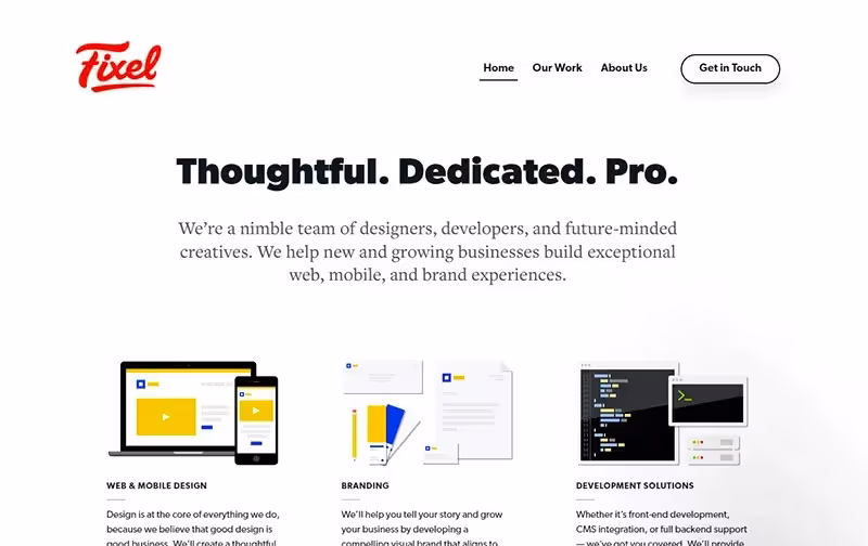 На главной странице мы видим иконки с кратким описанием основных услуг. Ниже представлен один из проектов — здесь можно подробнее почитать о том, какие именно задачи способна решить эта студия. За ним следует еще несколько примеров и список причин, почему стоит выбрать именно Fixel, а не кого-то из конкурентов.
