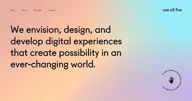 Use All Five — дизайн-студия из Лос-Анджелеса, которая занимается разработкой цифровых продуктов. Ее сайт выглядит достаточно традиционно, за исключением пастельной радужной цветовой палитры и анимированной руки, которая время от времени появляется на экране. Как мы уже неоднократно говорили, в привычном дизайне нет ничего плохого — его используют не просто так. Он действительно работает!