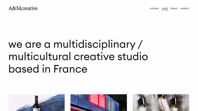 Не возникает никаких сомнений в том, чем занимается A&Mcreative. Это написано черным по белому на главной странице. "Мы — многопрофильная/мультикультурная креативная студия из Франции". Прокрутите страницу вниз, и вы увидите портфолио с реализованными проектами.