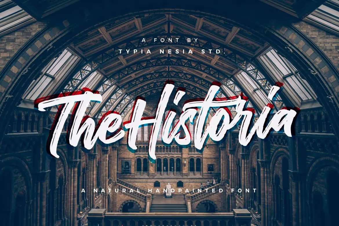 Historia — винтажный рукописный шрифт. Все буквы будто нарисованы кистью. Этот вариант будет отлично смотреться на постерах, обложках книг и баннерах. Он состоит из прописных и строчных букв, цифр и альтернативных глифов.