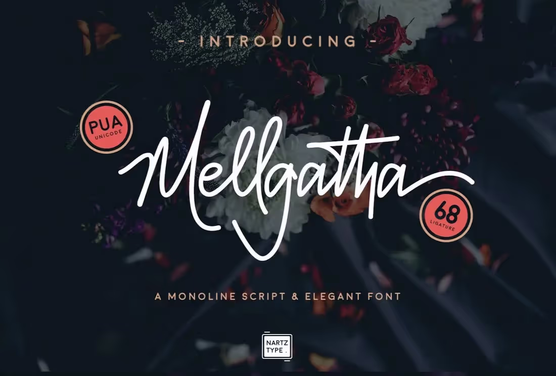 Этот креативный монолинейный рукописный шрифт включает множество лигатур, альтернативных глифов и поддерживает несколько языков. Наиболее выигрышно он будет смотреться на свадебных приглашениях и канцелярских товарах.