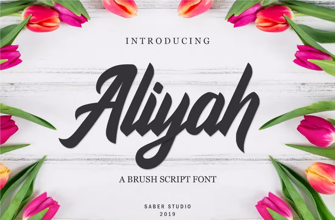 Aliyah — идеальный шрифт для поздравительных открыток и свадебных приглашений. Он выглядит креативно, буквы будто выведены кистью. Такая типографика точно сделает ваш дизайн более стильным и профессиональным.