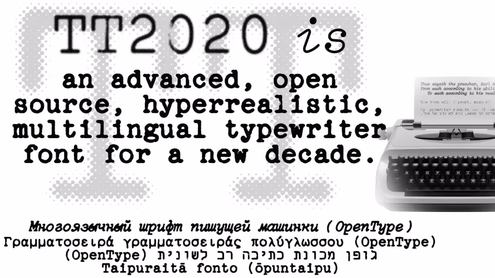 TT2020Base можно охарактеризовать как многоязычный гиперреалистичный шрифт пишущей машинки. Этот моноширинный шрифт, созданный Fredrick R. Brennan, поддерживает 59 языков и имеет 2 типа начертания: regular u regular italic. А два эти типа, в свою очередь, имеют 4 варианта глиф. Это означает, что в строке из восьми символов, таких как «EEEEEEEE», все E будут выглядеть по-разному. Выбор глифов TT2020 работает в большинстве программ. Бесплатный для личного и коммерческого использования.