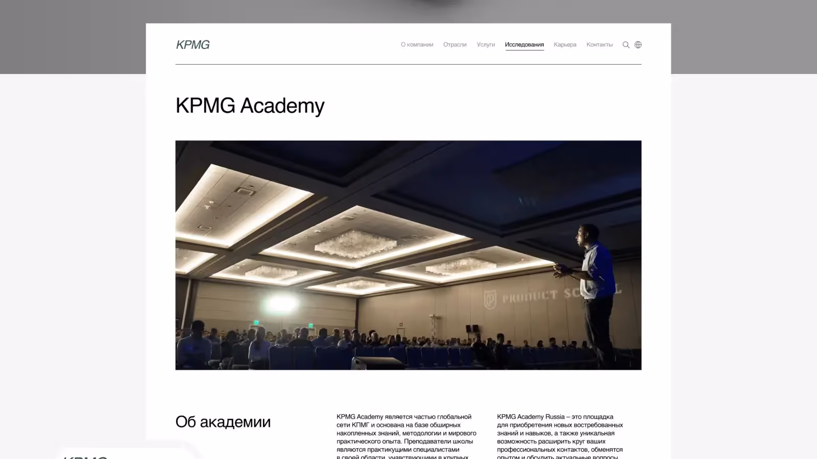Меня увлекла работа над главной страницей и страницей Академии KPMG. Здесь можно было разбавить строгую тематику нестандартными решениями.