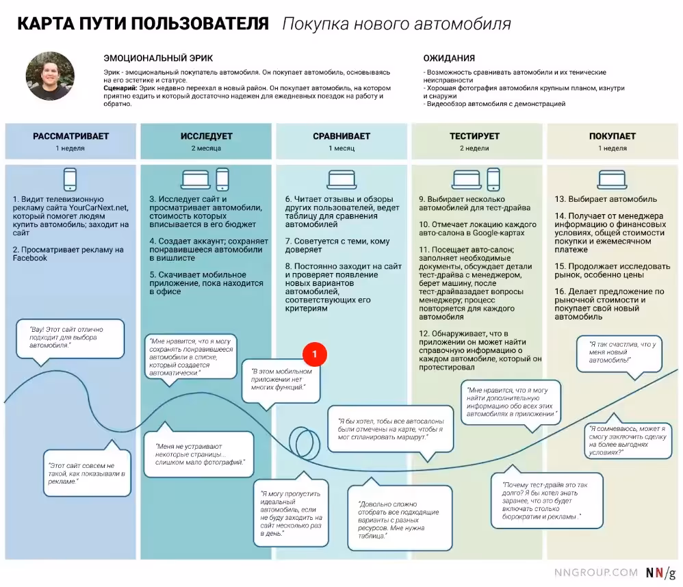Сначала Эрик собирался использовать мобильное приложение, но обнаружил, что в нем нет большого количества функций, которые есть на сайте. Он приложил усилия, чтобы скачать и установить приложение, но оно не оправдало его ожиданий. Эрик перестал пользоваться приложением в самом начале прохождения пути и упустил преимущества от его использования на более поздних этапах. Еще одной болевой точкой стал переход от этапа сравнения автомобилей на сайте к личному тест-драйву, так как на сайте не было возможности составить маршрут посещения автосалонов и отсутствовала информация, которая позволила бы сформировать адекватные ожидания по поводу тест-драйва.