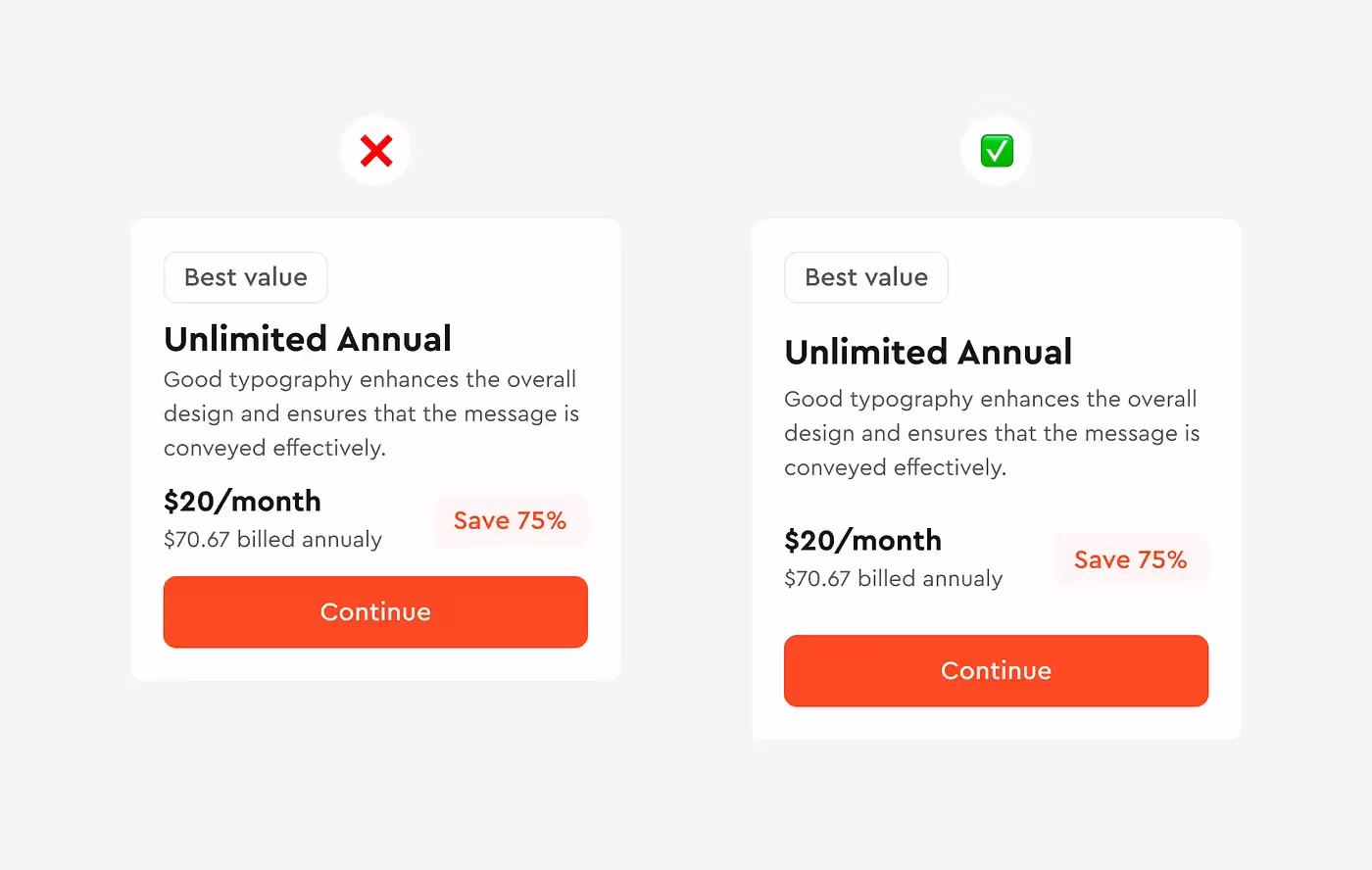 В первом примере стили кнопок настолько похожи, что у пользователей, в частности людей с нарушениями зрения, неизбежно возникнут проблемы с их дифференциацией. Во втором случае мы сразу понимаем, что более приоритетно.