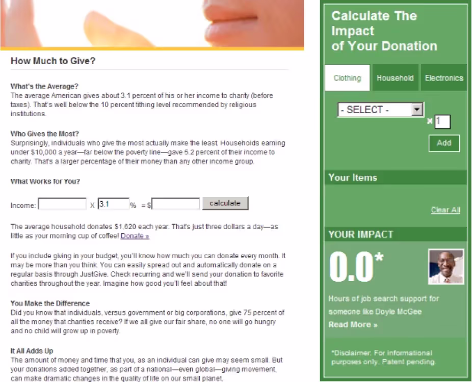 Создатели и одного, и второго сайта хотят, чтобы пользователи жертвовали деньги. Какой из них кажется вам более привлекательным? Если вы похожи на большинство людей, то второй. В отличие от первого, который пытается повлиять на действия пользователей с помощью текста, второй сайт содержит очень мало слов. Вместо этого он дает четкие ответы на вопросы, которые могут возникнуть у аудитории:
