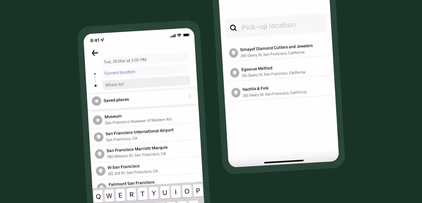 Поисковые подсказки — ключевая деталь в процессе заказа такси. Если пользователь пытается ввести какой-то новый адрес, но не знает точно, как сделать это правильно, подсказки на основе введенных им ключевых слов делают опыт более комфортным и простым. А отображение истории поисковых запросов позволяет забронировать поездку в один или два клика.