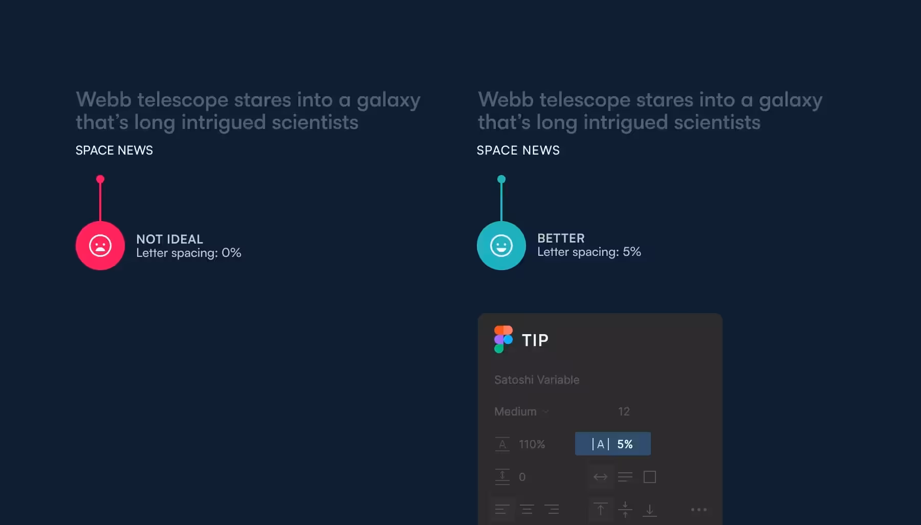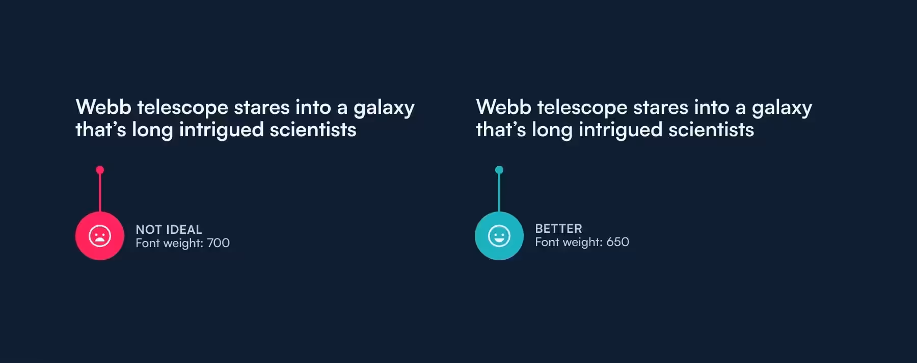 Светлый текст на темном фоне выглядит тяжелее. Это не только не слишком красиво, но и может негативно повлиять на читабельность текста (левый пример на рис. 1). Используйте вариативный шрифт и измените его начертание в темном режиме. Уменьшите его на 50. Так, если в светлом режиме начертание равно 700, в темном оно будет 650 (правый пример на рис. 1). Теперь текст выглядит более аккуратно и эстетично, а значит, его легче читать.