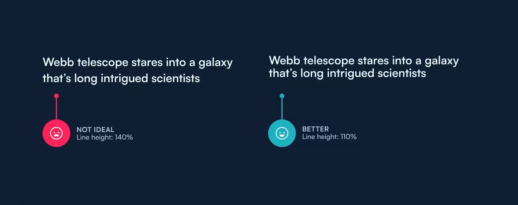 Как правило, заголовки короткие. Обычно это одна строка текста, иногда две. В крайних случаях они разбиваются на три строки. Рекомендуемая высота строки для основного текста — около 140%. Когда мы устанавливаем аналогичное значение для заголовков, создается впечатление, что строки отталкиваются друг от друга. Они будто не связаны между собой (левый пример на рис. 2). Уменьшите высоту строки заголовков до 110–120%. Так они будут выглядеть более компактными, целостными и эстетичными (правый пример на рис. 2).