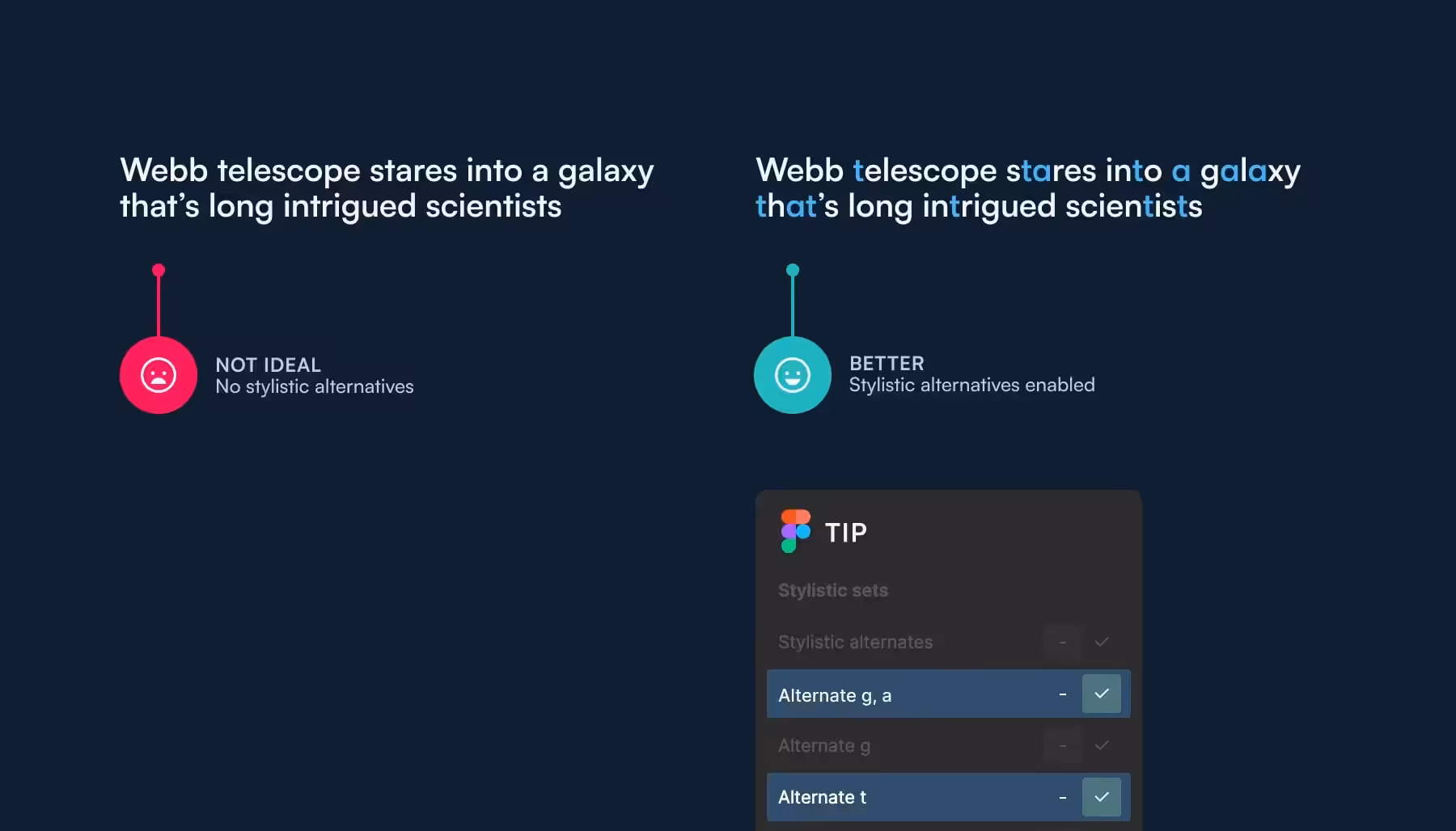 Функции OpenType становятся все более популярными. Это здорово, ведь их поддерживают все больше и больше шрифтов. Один из моих фаворитов — стилистические альтернативные глифы. Дизайнер, разработавший шрифт, предоставляет вам возможность использовать альтернативные символы. Чаще всего это дополнительные версии букв "a", "g" и "t".