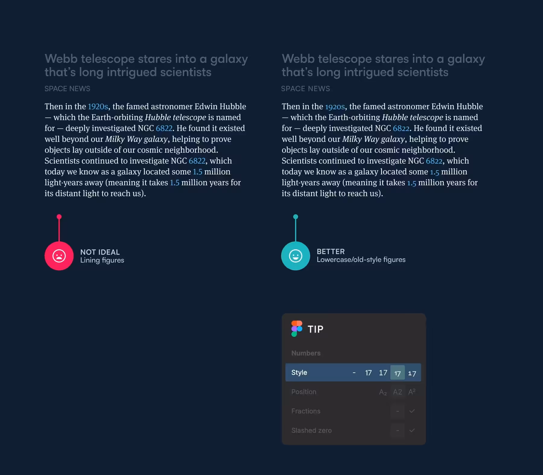 То же самое относится и к цифрам в вашем тексте. Если они равновысокие или заголовочные (lining figures) — обычно это стиль по умолчанию, — они выделяются слишком сильно (пример слева на рис. 5). Такие цифры притягивают взгляд читателя, даже если он не добрался до той строки, на которой они расположены. Пользователи отвлекаются, и читать становится труднее.