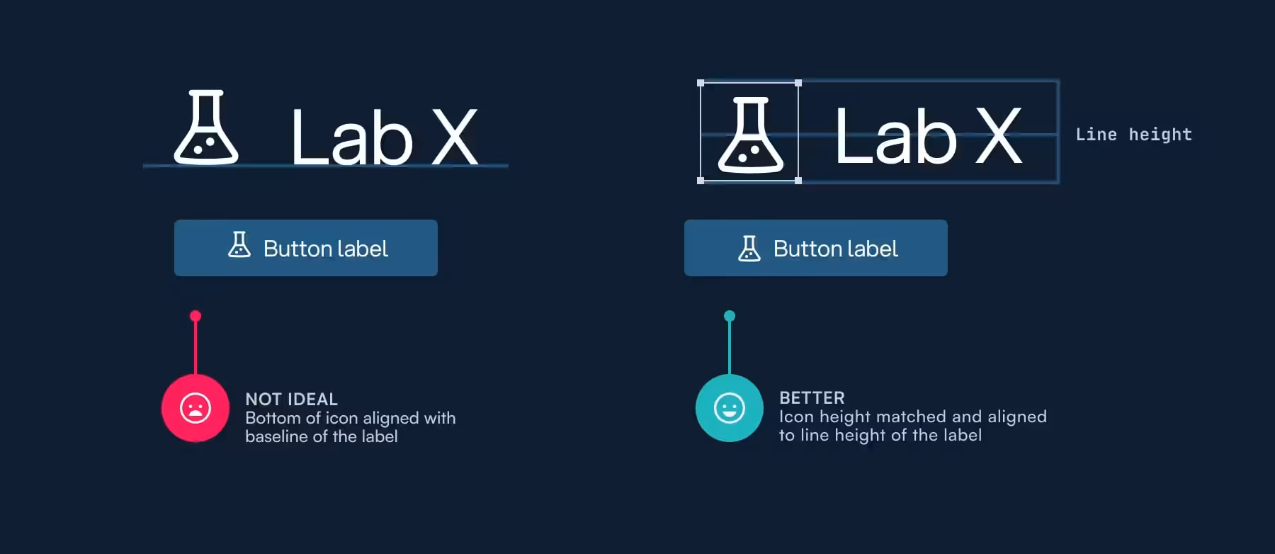 Эту ошибку я вижу постоянно. Многие дизайнеры пытаются выровнять нижнюю часть иконки по базовой линии подписи (левый пример на рис. 8). Ведь именно так всё выравнивается в типографике? Базовая линия — это сетка, на которую надо ориентироваться? Не совсем так. Когда дело доходит до выравнивания иконок по тексту, лучше всего сделать иконку той же высоты, что и строка ее подписи (правый пример на рис. 8). Если все сделано правильно, вертикальный центр значка будет идеально совпадать с серединой прописной буквы "X".