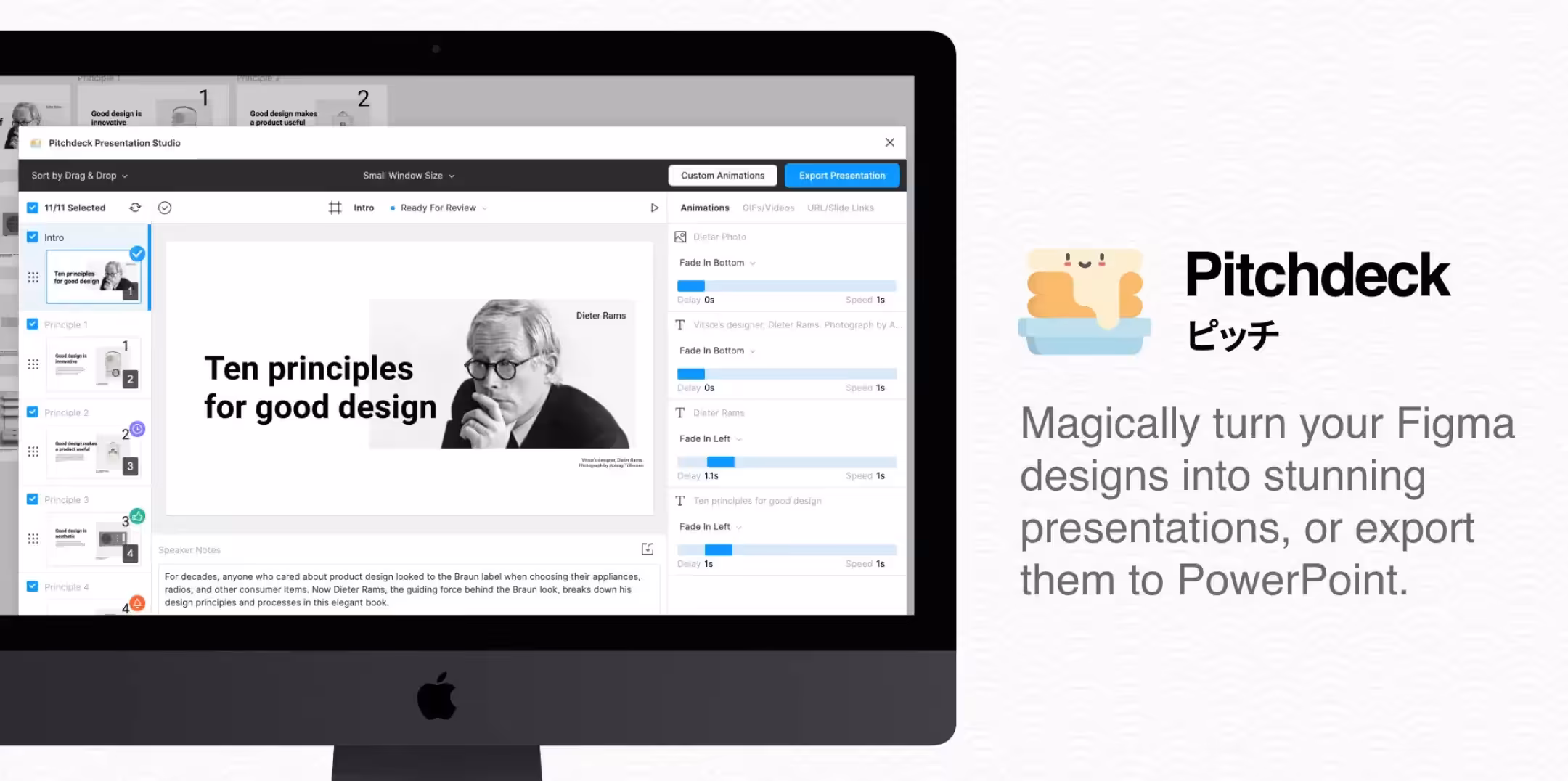 Классный и удобный плагин для создания презентаций в Figma. Отличается широким функционалом: можно добавлять любую анимацию и настраивать время ее продолжительности, делать заметки докладчика, использовать лазерную указку и различные элементы для управления слайдами. А потом экспортировать свою презентацию в статическую объединенную PDF-деку или в файлы PowerPoint (.pptx). Интересный момент, что автоматически генерируется защищенный паролем URL-адрес презентации, то есть посмотреть ее смогут лишь те, кому вы сами предоставите пароль. После 10 экспортированных проектов нужно будет приобрести лицензию.