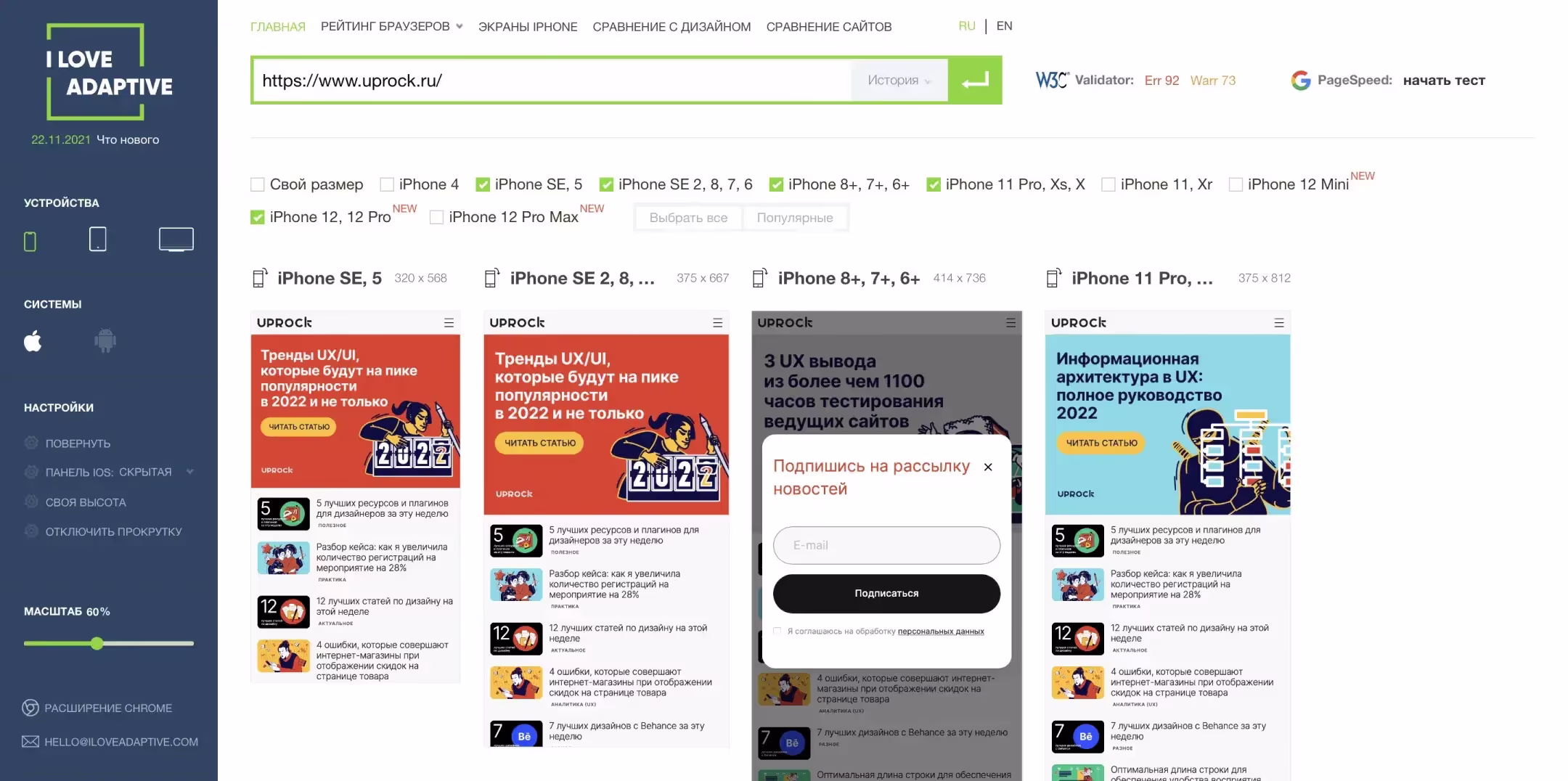 Данный бесплатный инструмент для тестирования сайтов на адаптивность разработало русское агентство 100UP для внутреннего использования, а в 2017 году сервис запустили в массы и сделали международным. Он позволяет проверить отображение верстки сайта на любых экранах с точностью до пикселя (pixel perfect), сравнить верстку с дизайн-макетами и убедиться, что на экранах смартфонов корректно отображается самая важная информация. Большой выбор устройств, моделей и операционных систем для тестирования вашего проекта на финальном этапе разработки.