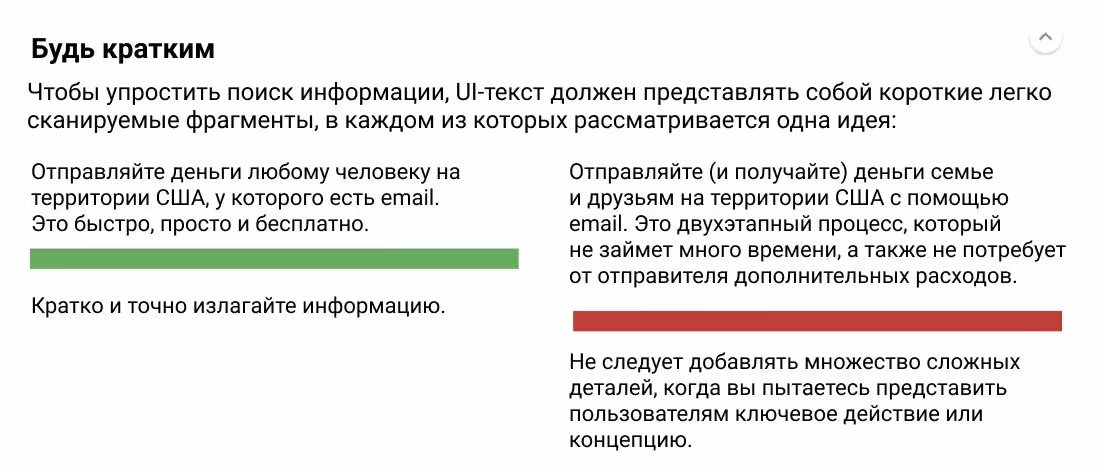 Ниже пример одного из таких принципов из руководства Google по материальному дизайну: “Будь кратким”. (Больше примеров можно найти на их сайте.)