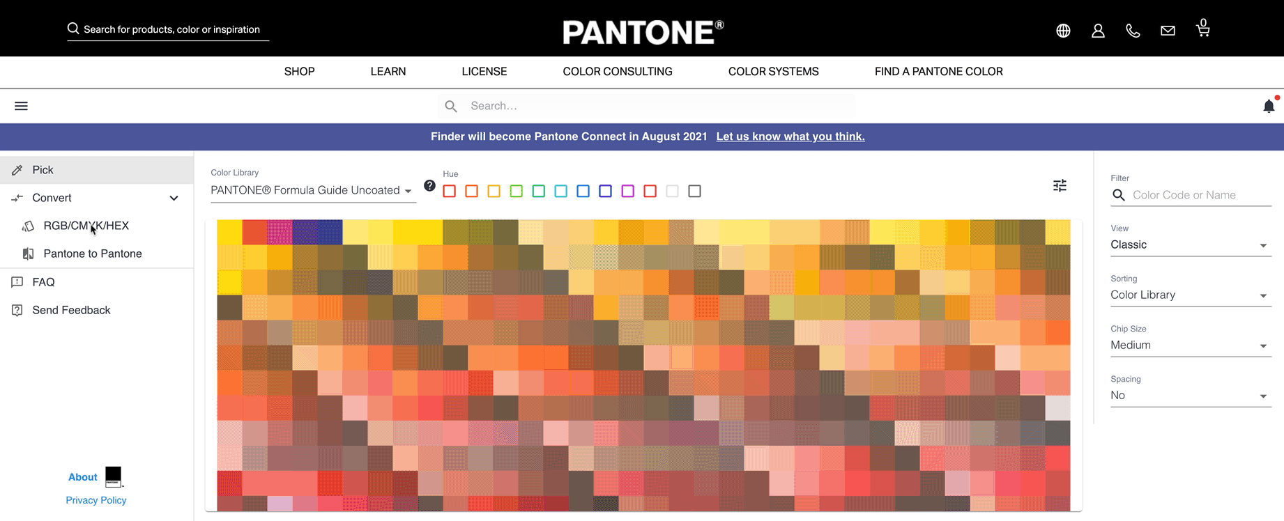 Существует множество онлайн-конвертеров. Самый известный — официальный конвертер Pantone на основе справочника цветов Color Bridge. Чтобы воспользоваться цифровой версией, нужна подписка в специальном приложении Pantone Connect.