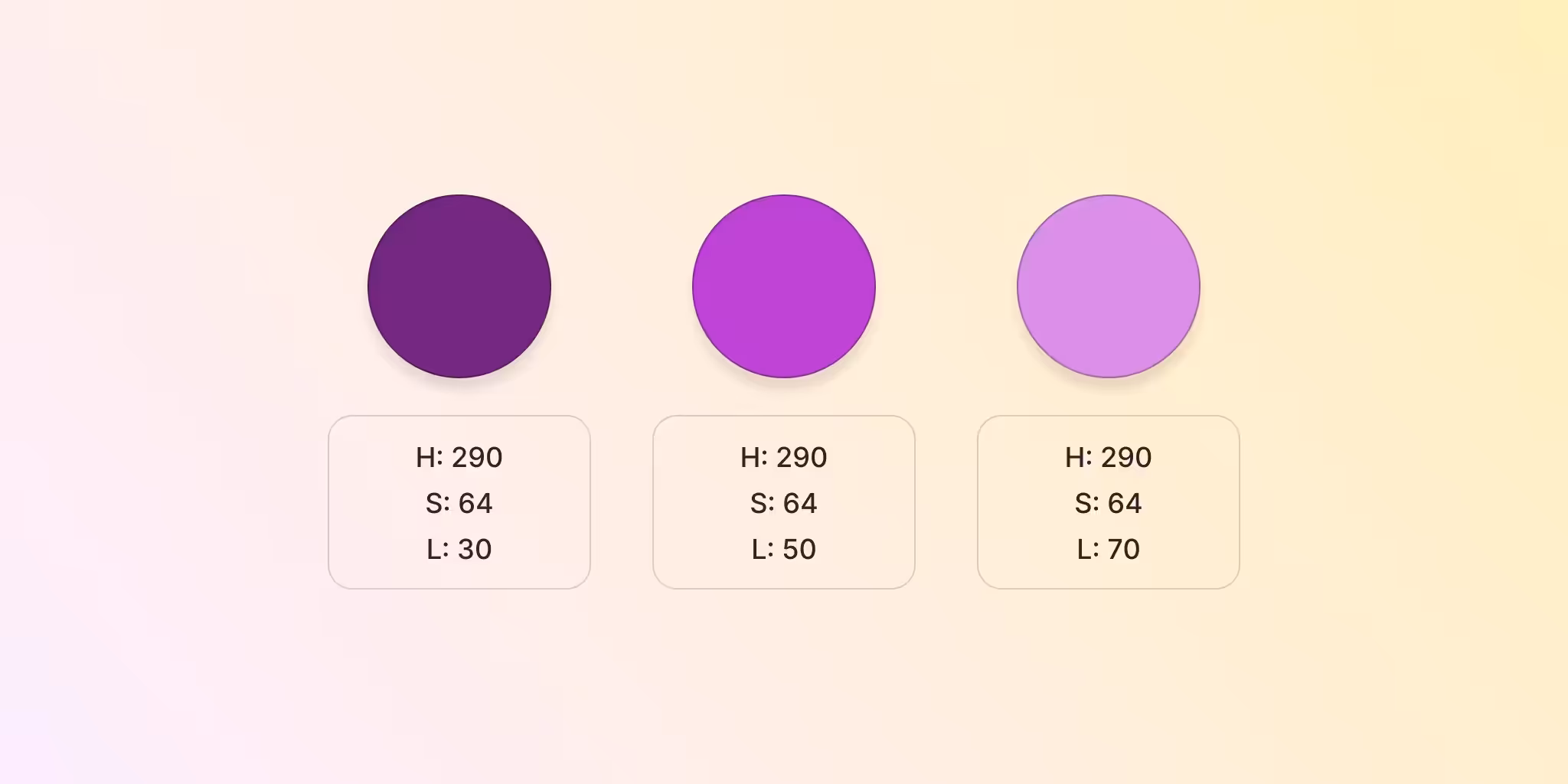Всё становится понятнее, когда вы знаете HSL-значение каждого цвета (Hue — оттенок, Saturation — насыщенность, Lightness — светлота). Вот пример того, как цвета с одинаковыми оттенками и насыщенностью выглядят темнее или светлее в зависимости от светлоты.