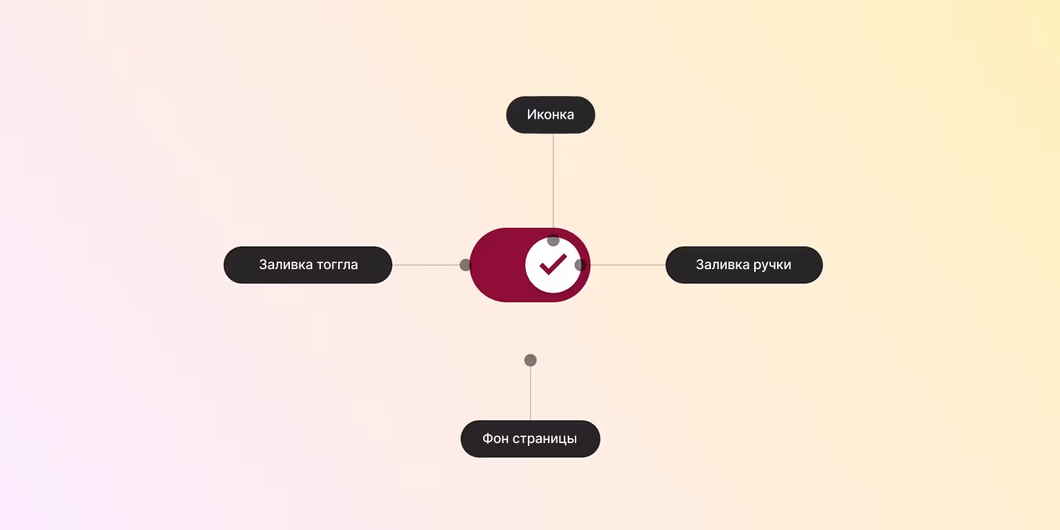 Помимо полей ввода, существуют и более сложные компоненты, такие как тогглы, которые состоят из нескольких частей. Например, в случае с активным тогглом нам необходимо правильно выбрать цвет иконки, заливки самого тоггла и ручки переключения и фона страницы.