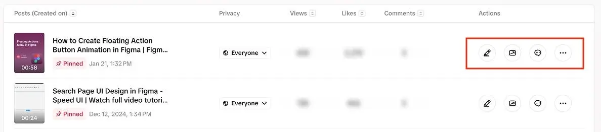 В TikTok каждая строка заканчивается иконками «Редактировать», «Просмотреть аналитику», «Просмотреть комментарии» и «Пользовательские действия».