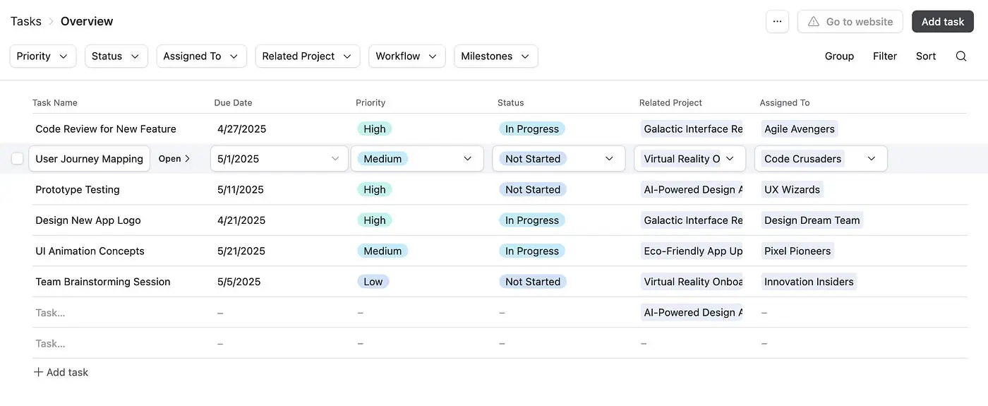 В Airtable опция «Открыть» отображается рядом с названием задачи, что помогает пользователям быстро выполнить соответствующее действие, не сканируя правую часть экрана.