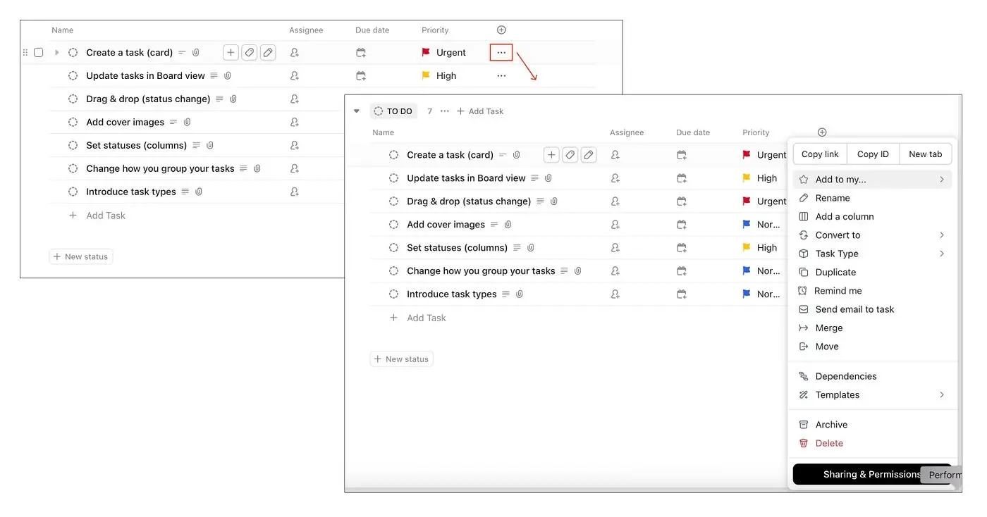 ClickUp использует горизонтальное многоточие (…) в качестве иконки дополнительных действий («Добавить в мои», «Переименовать», «Преобразовать в» и т.д.).
