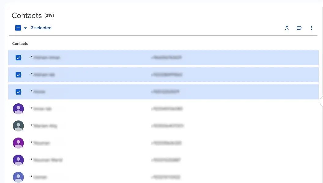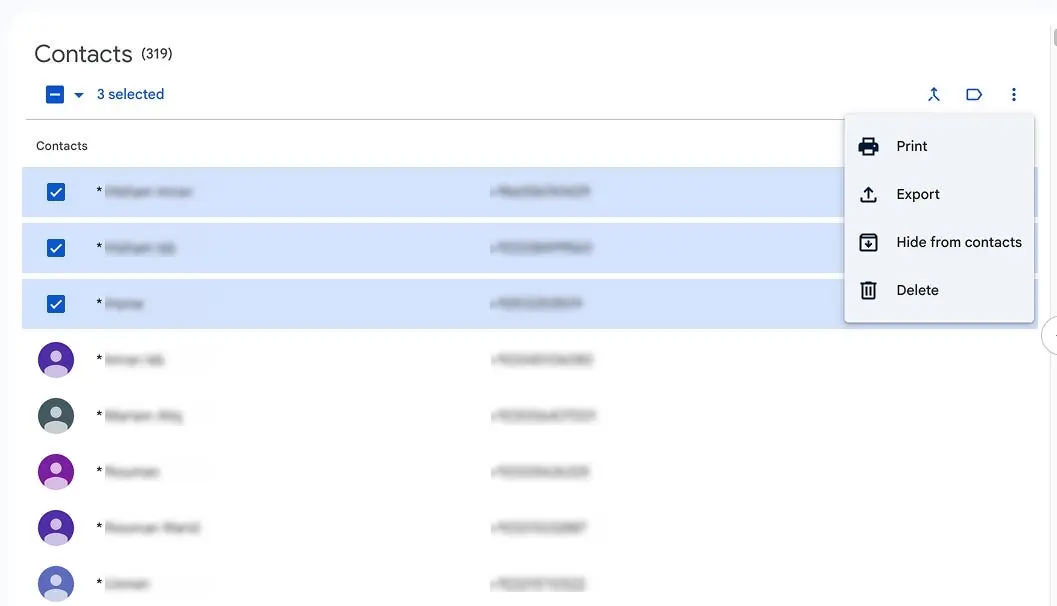 Когда пользователь выбирает несколько строк в Google Контактах, сверху появляется панель инструментов с иконкой дополнительных действий. Эта иконка открывает выпадающий список с релевантными опциями («Экспортировать», «Удалить» и т.д.).