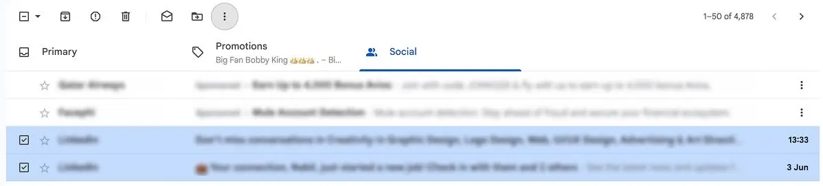 Когда пользователь выбирает несколько писем, Gmail отображает сверху панель с опциями «Удалить», «Архивировать», «Отметить как прочитанное» и т.д.