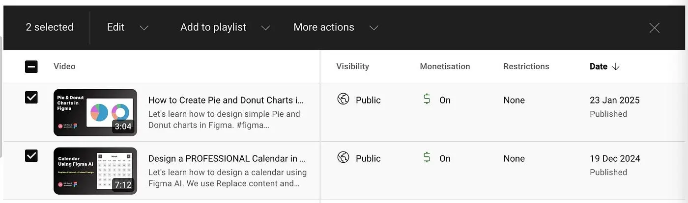 YouTube Studio показывает сверху панель инструментов с релевантными действиями, когда в таблице выбрано несколько элементов.