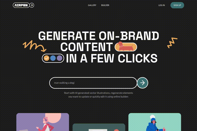 1. Airpen — AI-конструктор для создания иллюстраций. Этот стартап может похвастаться динамическим лого, способным адаптироваться к разным платформам и сценариям. Такое решение выглядит креативным и гибким. Динамический логотип наглядно демонстрирует бесконечные возможности инструмента — визуальные элементы сменяют друг друга, отражая разные темы и стили.