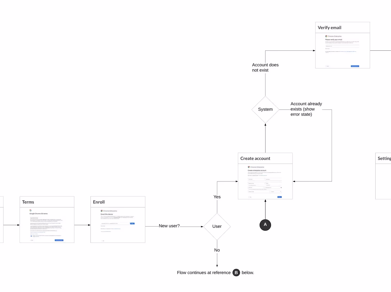 Работая над потоками, в которых есть условная логика, управляющая всем опытом, я начинаю с более общей блок-схемы, а затем со временем превращаю ее в более детальную блок-схему экрана. Прекрасное описание этого процесса вы можете найти в статье Васуда Мамтани "Почему пользовательские потоки важны для нашего процесса".