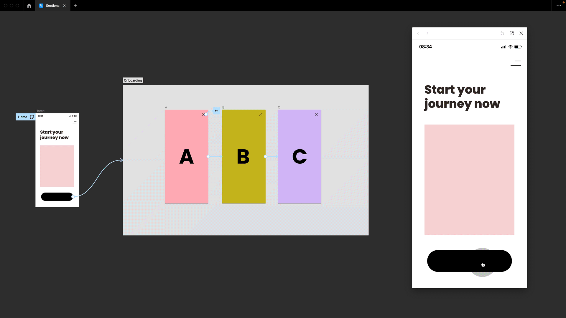 Секции также отлично подходят для создания прототипов. Когда мы размещаем внутри них фреймы, секции сохраняют состояния. Figma запоминает, какой фрейм в секции был просмотрен последним, и возвращается к нему, когда вы снова входите в секцию из любой точки вашего дизайна (вместо того, чтобы каждый раз открывать первый экран). Это очень удобно при проектировании процессов регистрации и оформления заказа.