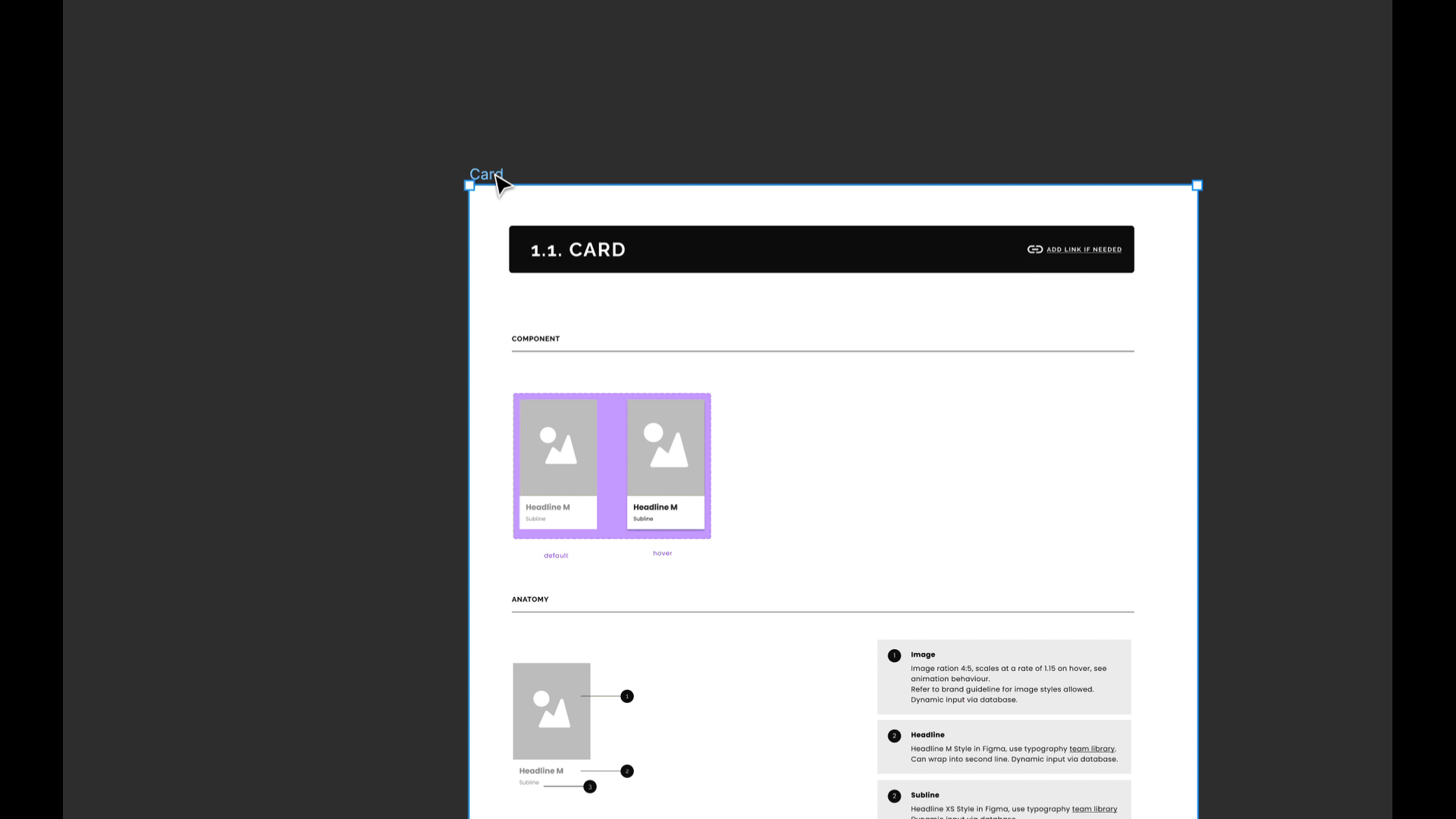 Спецификации создаются в виде отдельных фреймов, которые вы можете без труда перетащить в секцию с вашим компонентом, чтобы все было в одном месте.