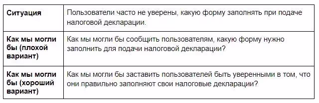 Несмотря на то, что это действительно так, мы хотим сократить расходы на ненужные контакты, высокие затраты являются симптомом основной проблемы (пользователи не уверены в процессе подачи заявки и поэтому звонят нам). На самом деле мы хотим решить ситуацию: почему пользователи звонят нам, которую рассматривает второй вопрос “Как мы могли бы…”. Желаемым результатом наших усилий по разработке должно стать повышение доверия пользователей к процессу подачи заявки.