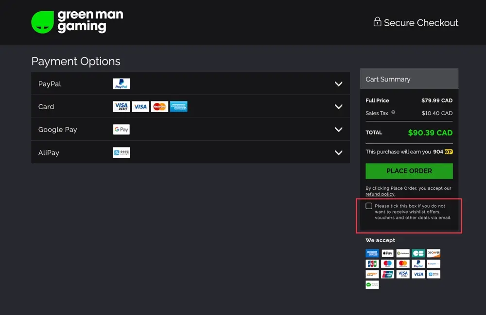 Вопросы с подвохом часто появляются в формах регистрации или оформления заказа, особенно в виде крошечных сносок. Например, на странице оформления заказа Green Man Gaming был чекбокс с надписью «Пожалуйста, отметьте это поле, если вы не хотите получать предложения по электронной почте».