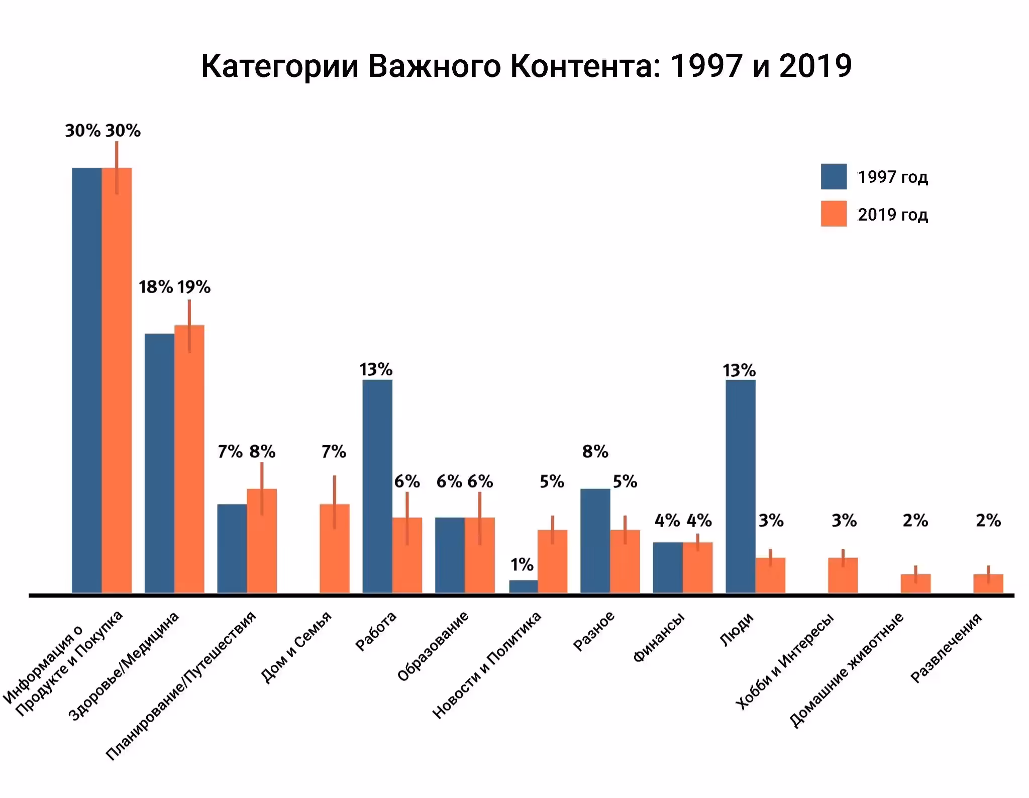 В целом, категория Информация о продукте и Покупка была наиболее часто упоминаемым видом контента (30% всех ответов), за которым следовала категория Здоровье (19%). Результаты не сильно изменились по сравнению с исследованием 1997 года, когда 30% ответов приходилось на категорию Информация о продукте и Покупка, а 18% были классифицированы как Медицина. Несмотря на то, что интернет стал намного более развитым, примечательно, что эти две основные категории контента по-прежнему были самыми востребованными почти в половине очень важных событий.
