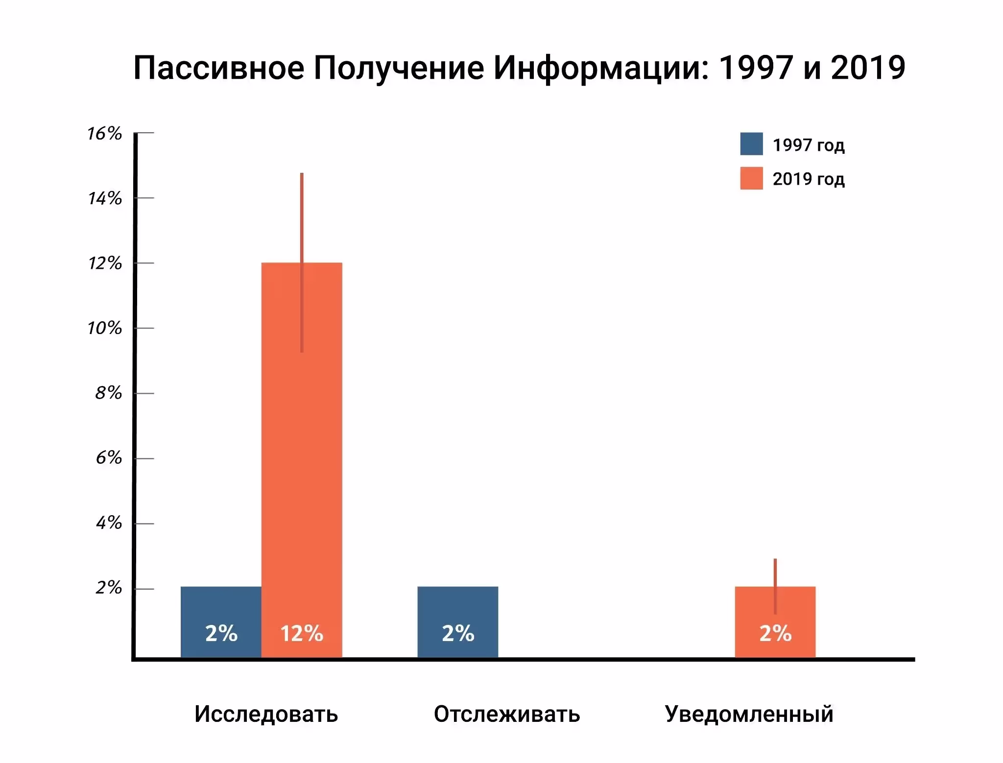 Информационные технологии кардинально изменились с 1997 года. Но изменилось ли поведение пользователей? И, в частности, изменилось ли каким-либо образом влияние интернета на нашу жизнь? Наше исследование показало, что интернет стал основным, авторитетным источником информации. Большинство действий, которые люди выполняют в сети, связаны с тем, чтобы собрать данные и разобраться в актуальной теме. 22 года назад наиболее важными и запоминающимися событиями, связанными с интернетом, были сравнение и выбор между различными продуктами или источниками информации для того, чтобы принять решение. Несмотря на то, что эти виды деятельности все еще широко распространены сегодня, они часто являются побочным действием самообразования и сбора данных по теме. Также интересно, что значительная часть информации, которую мы собираем в интернете, является пассивной. Мы ее даже не ищем, а просто получаем с помощью уведомлений или случайно во время просмотра данных в сети. (Пассивное получение информации, возможно, связано с автоворонками. Так как мы проводим все больше и больше времени в интернете, перепрыгивая с одного сайта на другой, мы, по сути, узнаем все больше информации, которую не ищем).