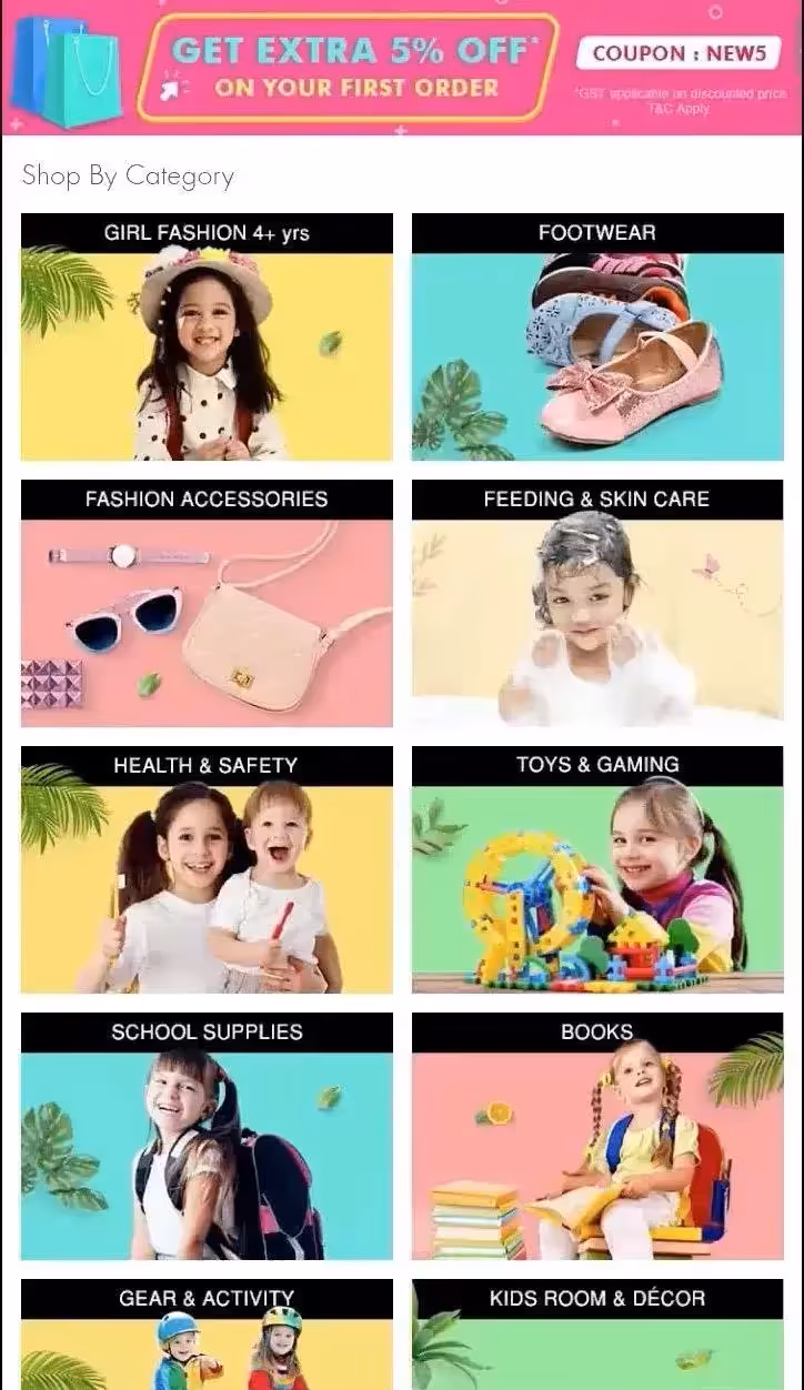 Firstcry, коммерческий сайт, который продает товары для младенцев и детей, активно использует изображения в своих элементах навигации на сайте. Одна участница, говорящая на хинди, которая не читала по-английски, смогла оформить покупку на сайте, полагаясь на эти изображения. Участница покупала подарок для трехлетней дочери подруги. На странице "Магазин по категориям" Firstcry она увидела фотографию девочки с рюкзаком (с надписью "ШКОЛЬНЫЕ ПРИНАДЛЕЖНОСТИ"). Судя по скриншоту, она решила купить рюкзак для дочери своей подруги или же для своей дочери.