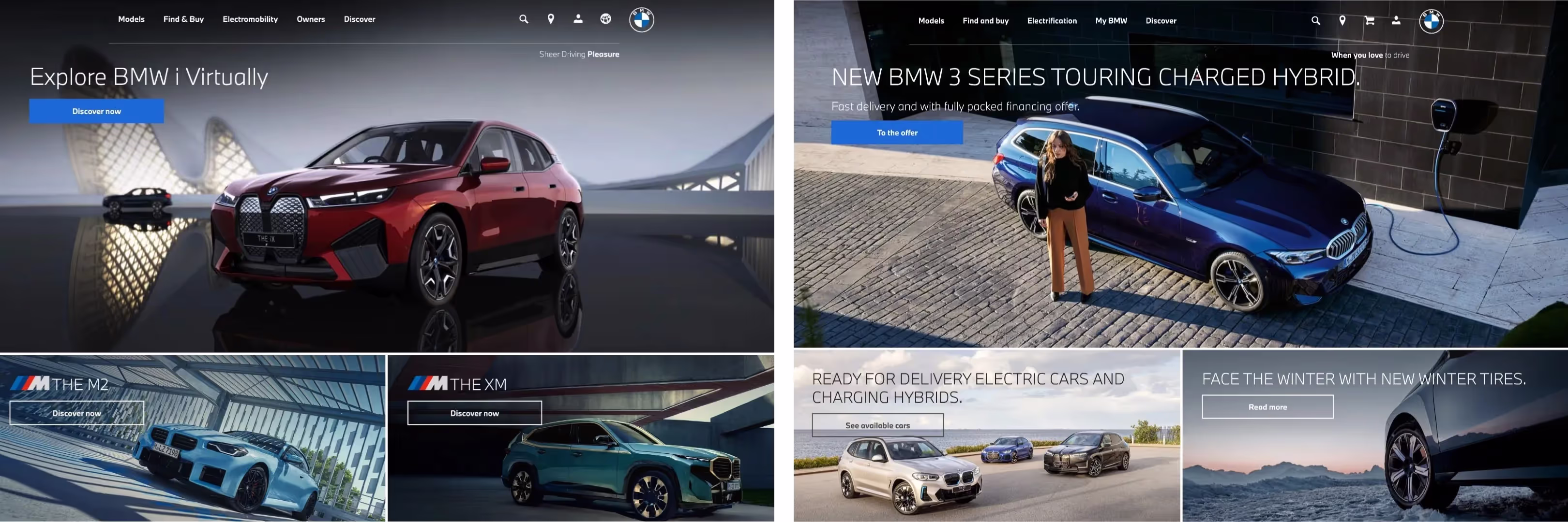 На сайте BMW в Малайзии основное внимание уделяется автомобилям. На фотографиях они сняты спереди или снизу, благодаря чему кажутся больше. Логотип BMW хорошо виден на каждой фотографии.
