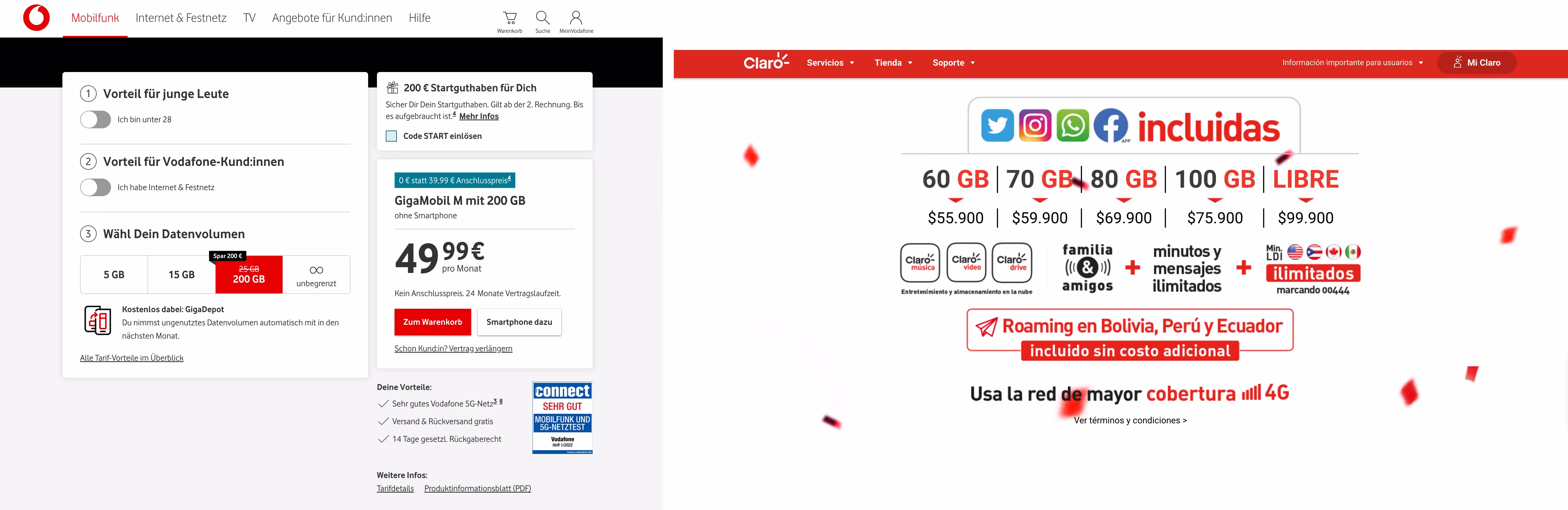 В коллективистской Колумбии компании придерживаются иного подхода. Местный провайдер Claro учитывает пожелания пользователей. Claro показывает, что план включает весь трафик социальных сетей (будьте на связи со своими друзьями), неограниченное время разговоров с отдельными странами, включая США (звоните родственникам), а отметка «Семья и друзья» еще больше акцентирует на этом внимание.