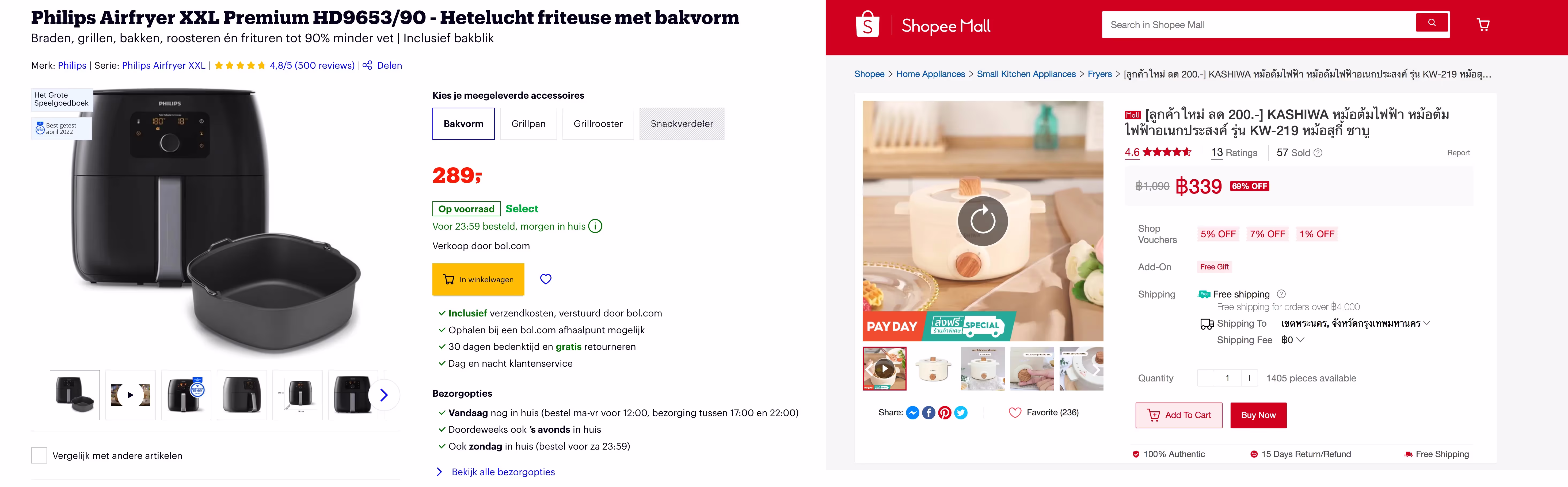 Голландский сайт Bol содержит отзывы, как и все маркетплейсы. Однако им отводится довольно мало места. Тайский сайт Shopee не только делает больший акцент на оценках и отзывах, но и в качестве социального доказательства сообщает, сколько покупателей приобрели конкретный товар.