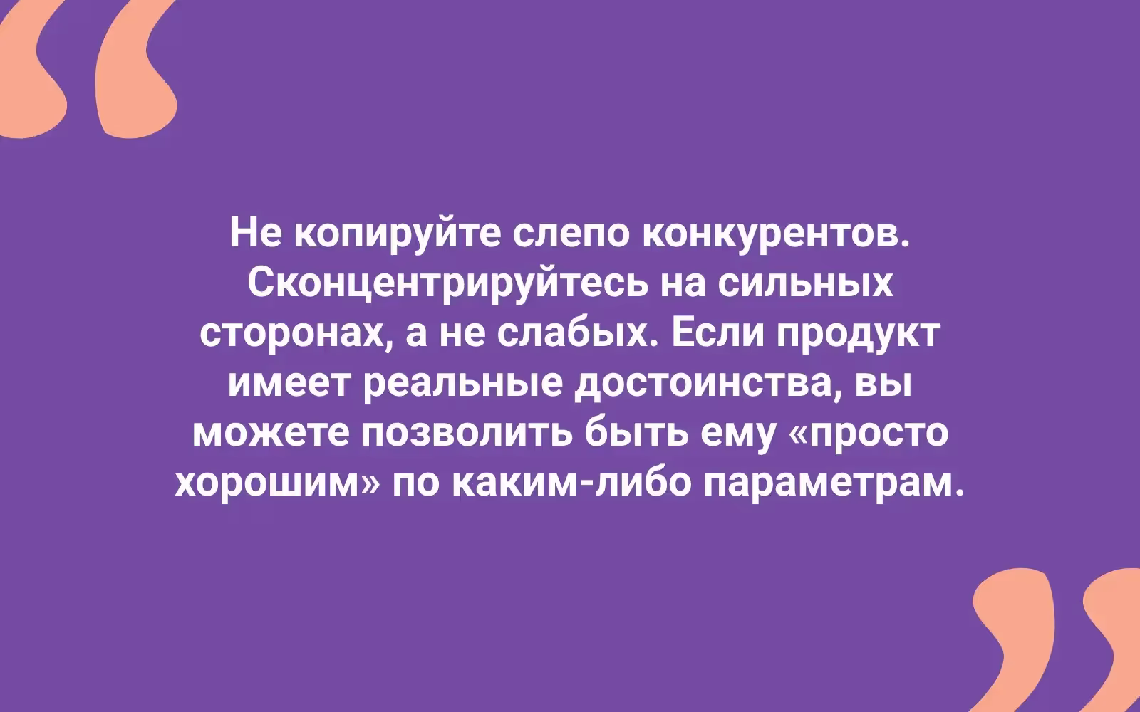 Сконцентрируйтесь на сферах деятельности, в которых ваш продукт является самым лучшим, и продолжайте целиться в это место. Стимулируйте спрос, акцентируя внимание пользователей на сильных сторонах продукта. Данный подход поможет вам выделиться в ряду средних по качеству товаров.