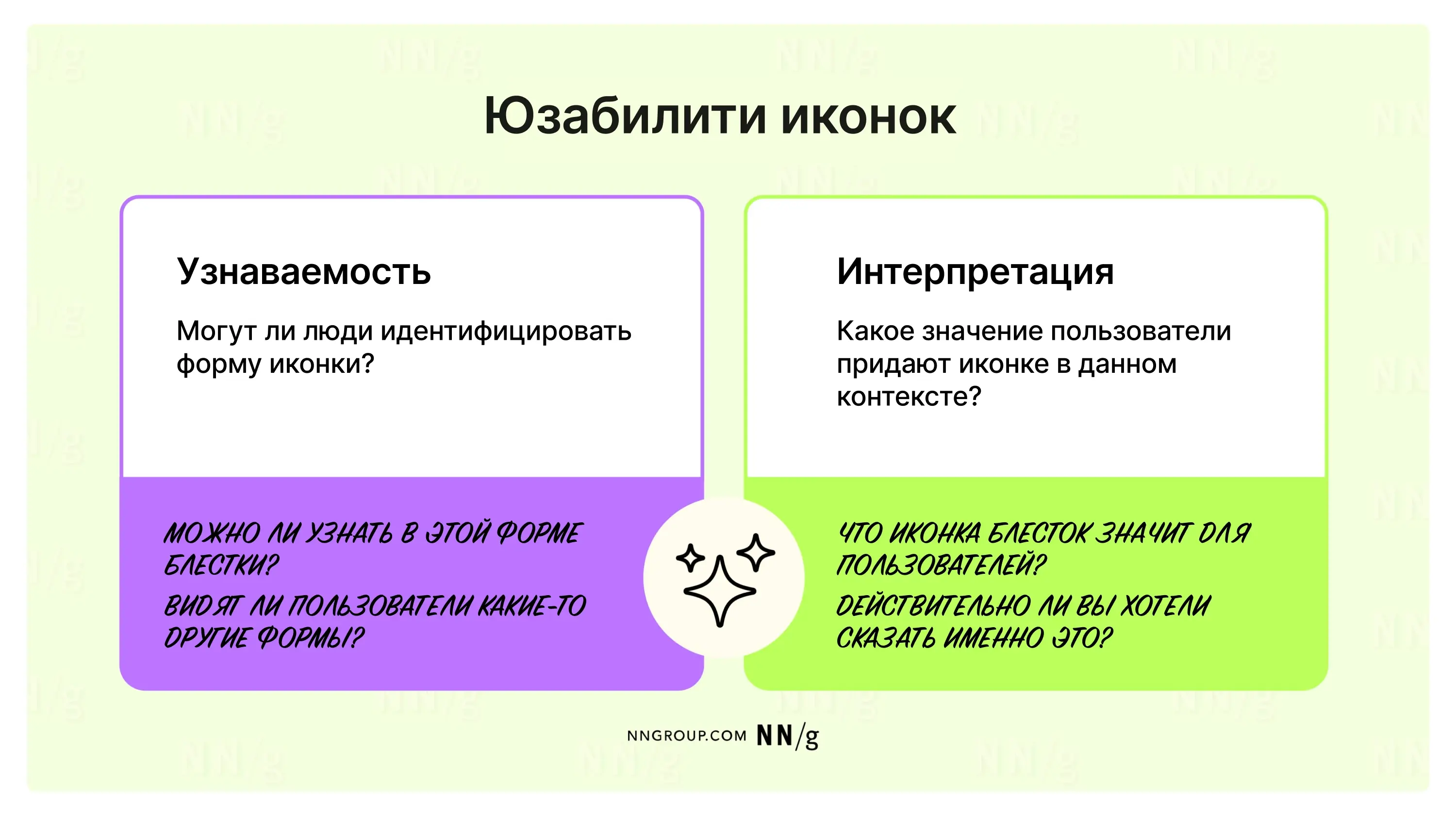 - Интерпретация — какое значение пользователи придают иконке в определенном контексте. (Что означает звезда в данном конкретном интерфейсе?)