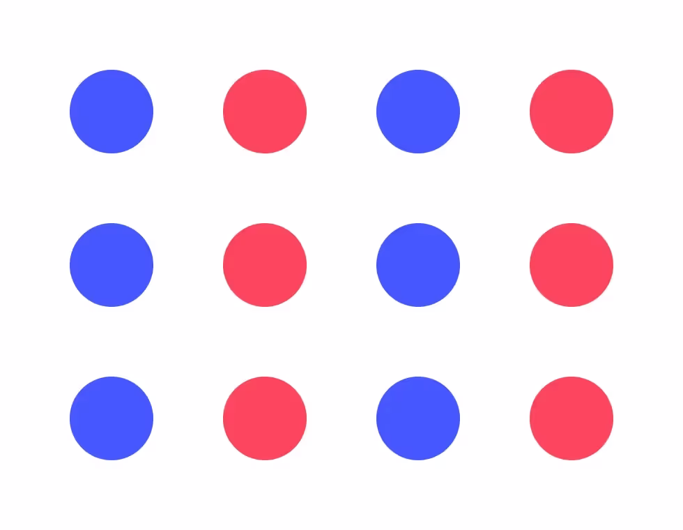 На картинке выше 12 кружков похожи друг на друга по всем параметрам, кроме цвета. Наш мозг улавливает это и группирует объекты по цветам на основе принципа сходства. Таким образом, вместо того чтобы воспринимать изображение как группу из 12 кругов (или три ряда по четыре круга), мы, скорее всего, увидим чередующиеся столбцы двух цветов.