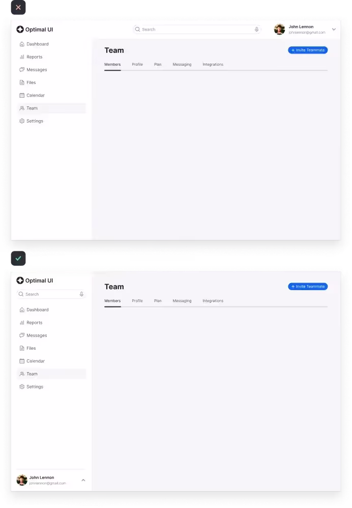 Проблема боковых меню заключается в том, чтобы понять, где лучше разместить учетную запись пользователя и панель поиска. Большинство дизайнеров предпочитают размещать их в верхней части экрана. Однако, если у вас есть дополнительная навигация, эта область может выглядеть перегруженной.